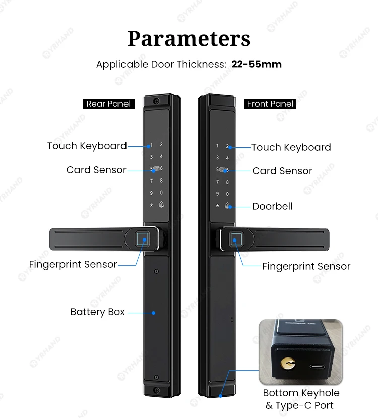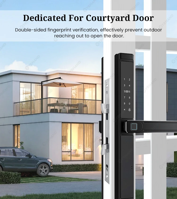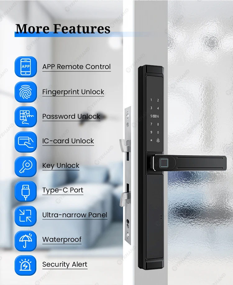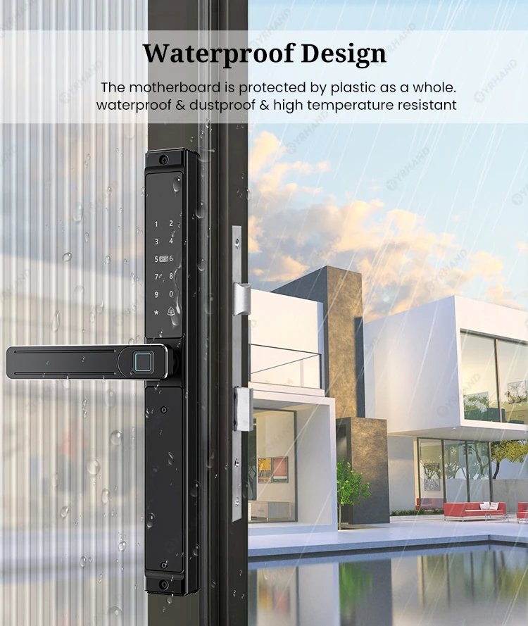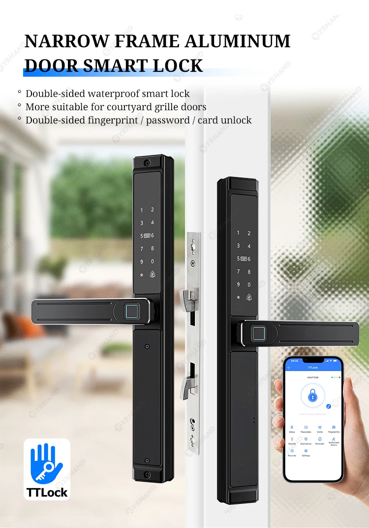 قفل ذكي لباب من الألومنيوم بإطار ضيق - مقاوم للماء على الوجهين، وبصمة الإصبع، وكلمة المرور، والبطاقة، والتحكم في التطبيق