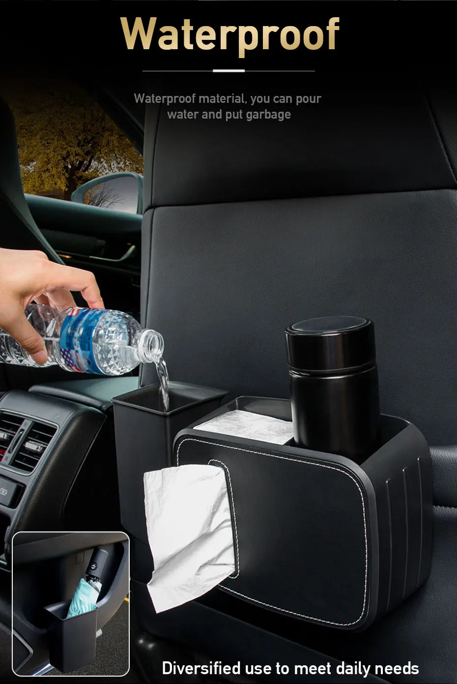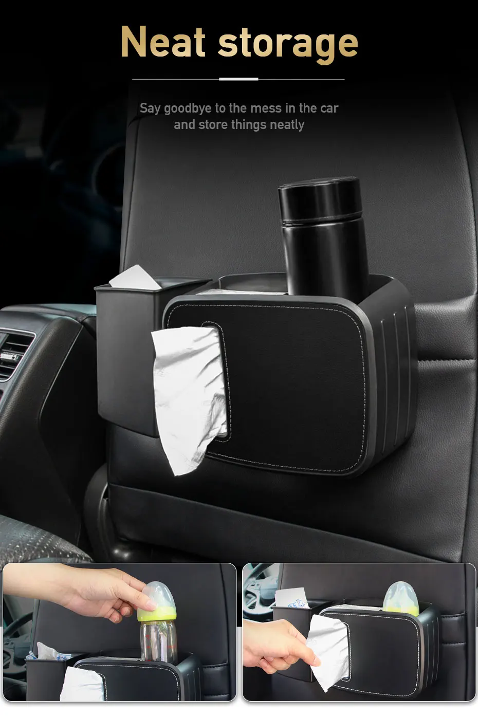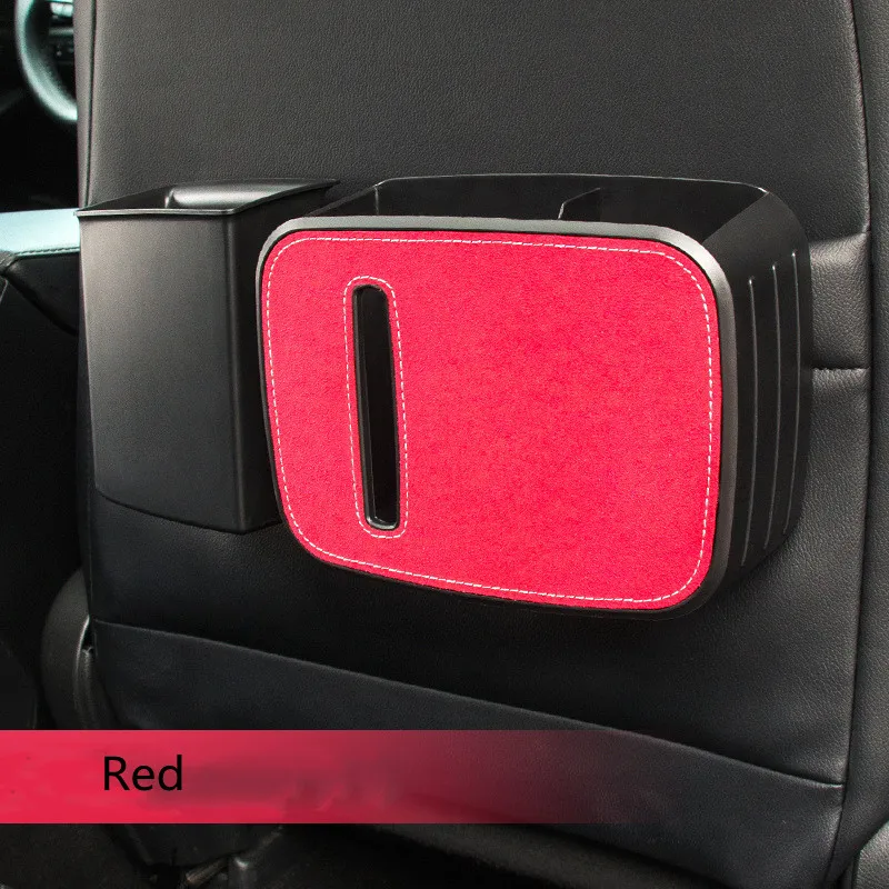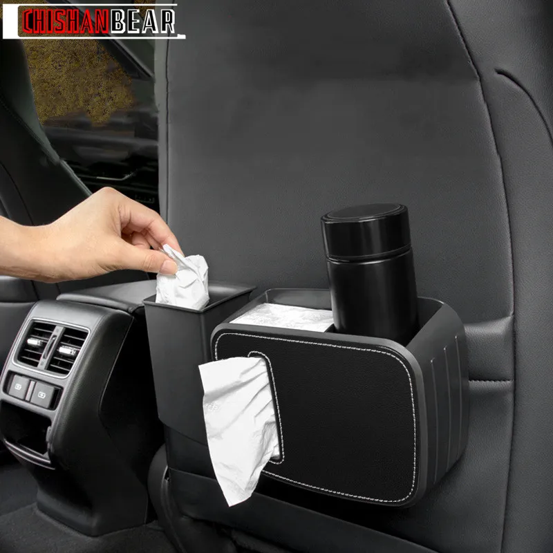 صندوق تخزين متعدد الوظائف للسيارة تفاصيل داخلية مزدوجة معلقة مقسمة سلة مهملات / حامل مناديل / حامل أكواب ماء منظم خلفي للمقعد